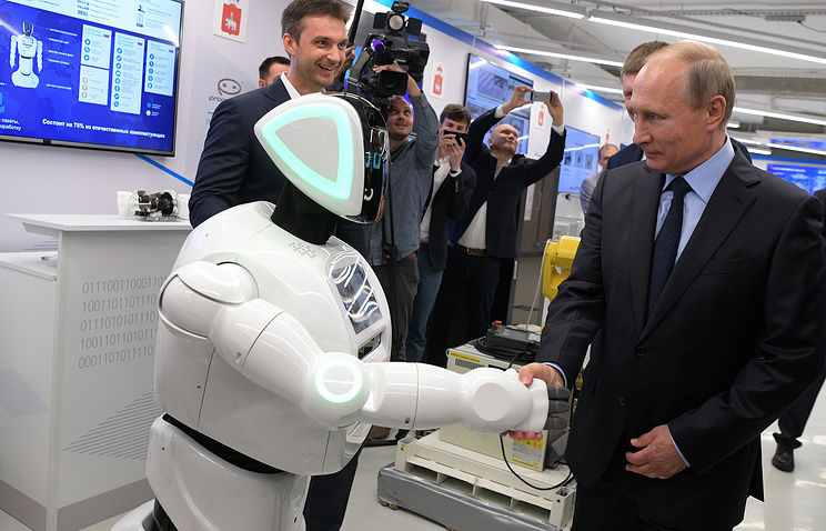 Финальным экспонатом стал робот-промобот. «Здравствуйте, Владимир Владимирович», — сказал робот. Путин поздоровался с ним за руку.