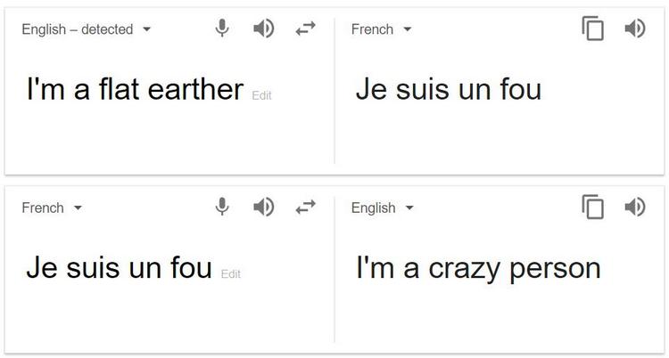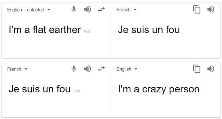 В переводчике Google обнаружили забавную особенность. Если установить режим перевода с английского на французский и ввести в поле фразу «i’m a flat earther» («я — сторонник теории плоской Земли»), то сервис переведет ее как «я сумасшедший» (je suis un fou), сообщил портал RG Digital.