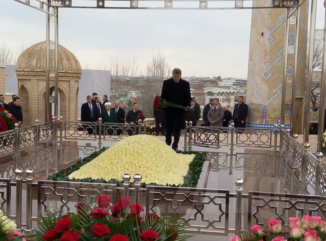 После приветствия и совместного фотографирования главы двух государств прибыли к мавзолею «Шахи Зинда», где Алмазбек Атамбаев со своим узбекским коллегой Шавкатом Мирзиеевым возложили цветы к могиле первого президента РУз Ислама Каримова.