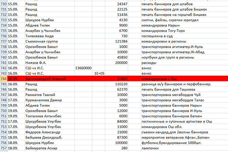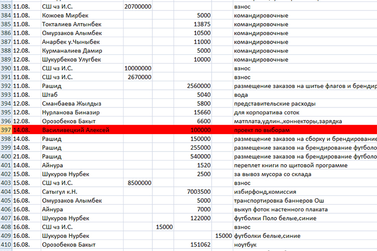 — В документе Токтакунова сказано, что Илмиянов как раз был передаточным звеном — деньги доставал откуда-то Жээнбеков. Приносил ли Илмиянов в кассу штаба что-либо, судить не берусь, не имею достоверной информации.