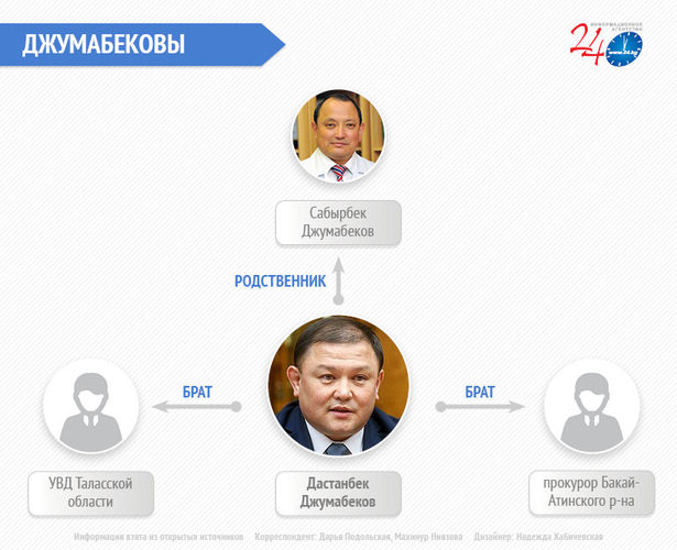 Еще двое братьев торага работают в силовых структурах. Один возглавляет УВД Таласской области, другой — прокурор Бакай-Атинского района.