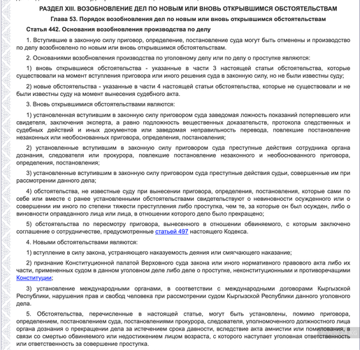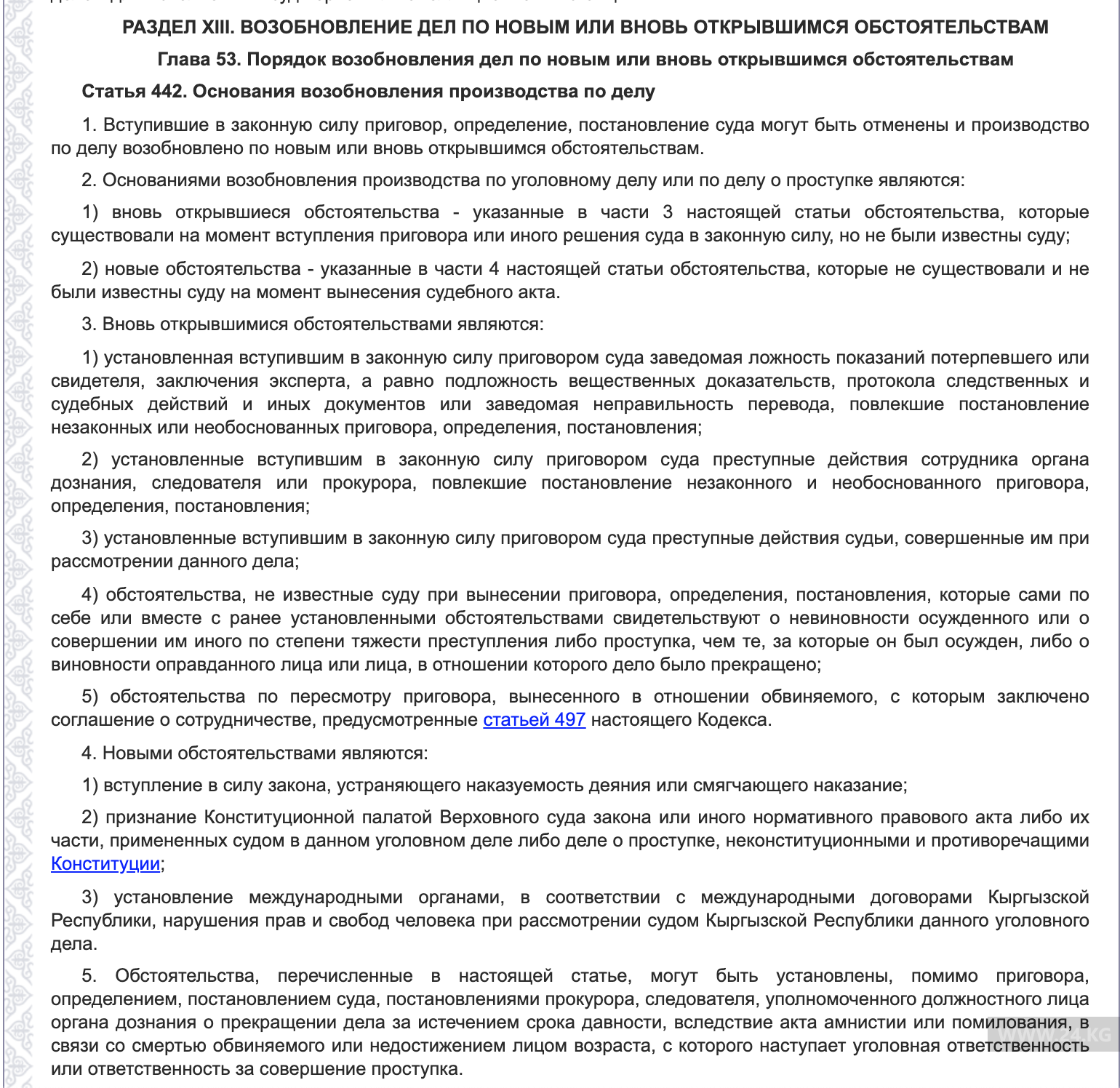 Эксперты напоминают, что к исключению обсуждаемой нормы привела корректировка статьи 442 УПК КР. В ней рассматриваются основания для возобновления производства по уголовному делу согласно новым обстоятельствам.