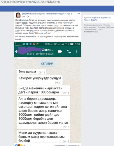 Пользователь Бурул Усманали (Бурул Усманалиева, кандидат от партии «Реформа» под № 53) разместила на своей странице «новость» о том, что она раскрыла схему подкупа избирателей партией «Мекеним Кыргызстан».