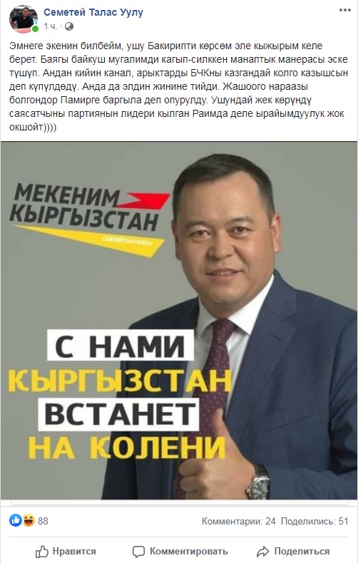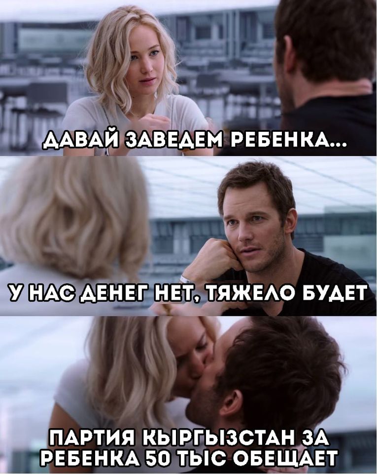 Немало курьезных моментов связано с партией «Кыргызстан». В своей программе они обещают выплачивать за рождение ребенка по 50 тысяч сомов. В Сети на это отреагировали с юмором.