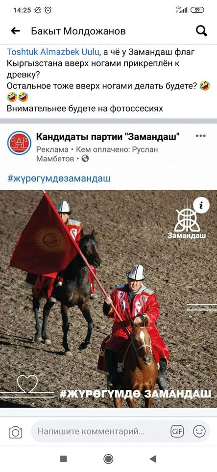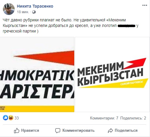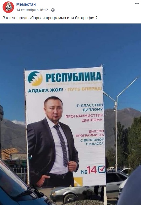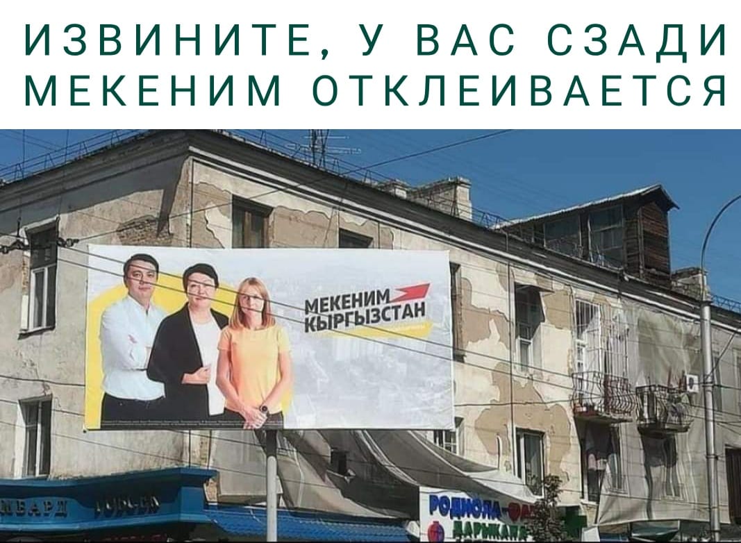 Цвета логотипа партии «Биримдик» сравнивают с флагом Российской Федерации. Обсуждают в интернете и выступление кандидата от партии «Биримдик» Махабат Мавляновой. На встрече с избирателями она не смогла выговорить слово «коалиция». Политорганизация «Бир Бол» выбрала для себя оранжевый цвет. В начале агитационного периода кандидаты вышли на субботник в кепках и футболках оранжевого цвета. В Сети предположили, что кандидаты в депутаты могут работать доставщиками еды известного бренда, который тоже представлен в оранжевом цвете. Пользователи Facebook выложили в Сеть фотографию баннера партии «Республика». На фото изображен мужчина. Подписи рядом на кыргызском и русском языках гласят «Диплом программиста с дипломом 11-го класса». Помимо этого, интернет пестрит шуточными высказываниями, комментариями и другими картинками от пользователей Сети.