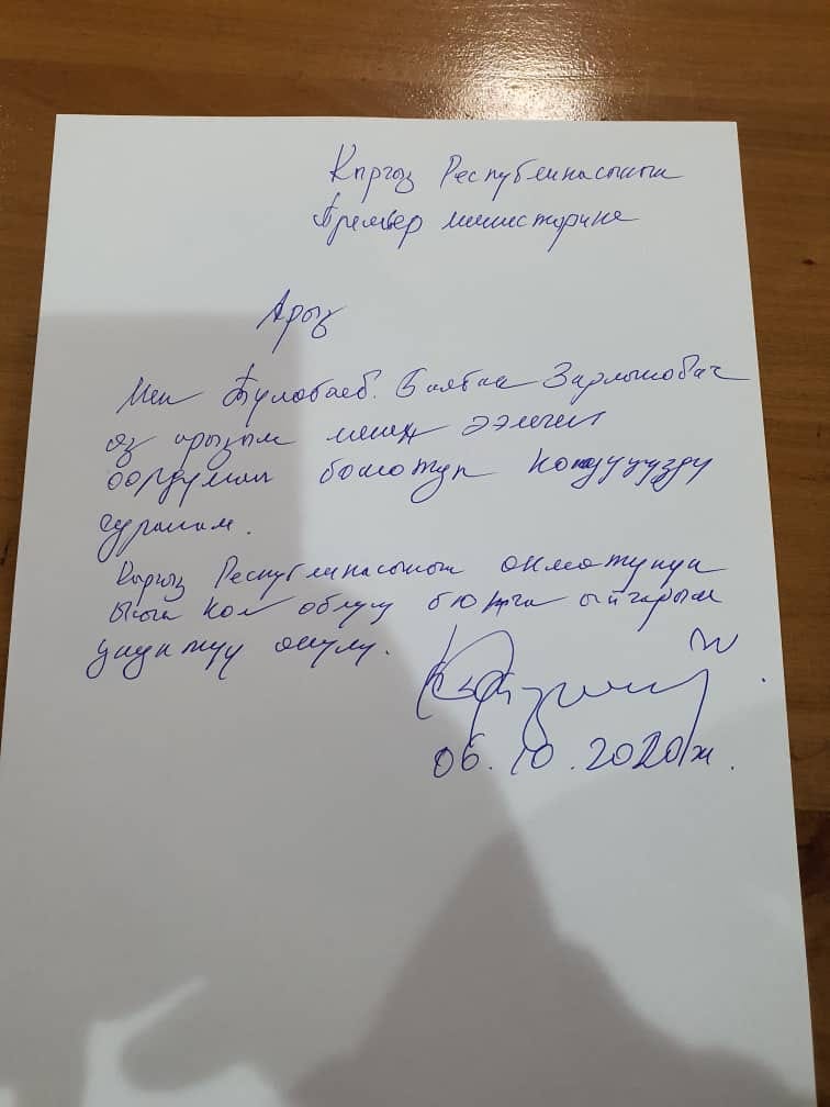 Полномочный представитель правительства в Иссык-Кульской области Балбак Тулобаев написал заявление об уходе по собственному желанию. Фото его заявления опубликовали в социальной сети.