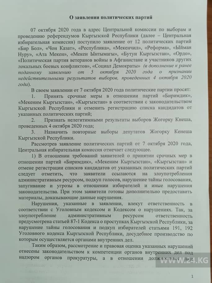 Напомним, что лидеры политобъединений просили принять меры в отношении партий «Биримдик», «Мекеним Кыргызстан» и «Кыргызстан» за массовые нарушения в ходе голосования. В Центризбиркоме отметили, что нарушения, перечисленные в обращении, попадают под статьи Уголовного кодекса и Кодекса о проступках, и рекомендовали направить материалы в Генпрокуратуру и МВД, уточнив, что ЦИК не следственный орган. Избирательная комиссия подтвердила, что итоги выборов, прошедших 4 октября, признаны недействительными и аннулированы.