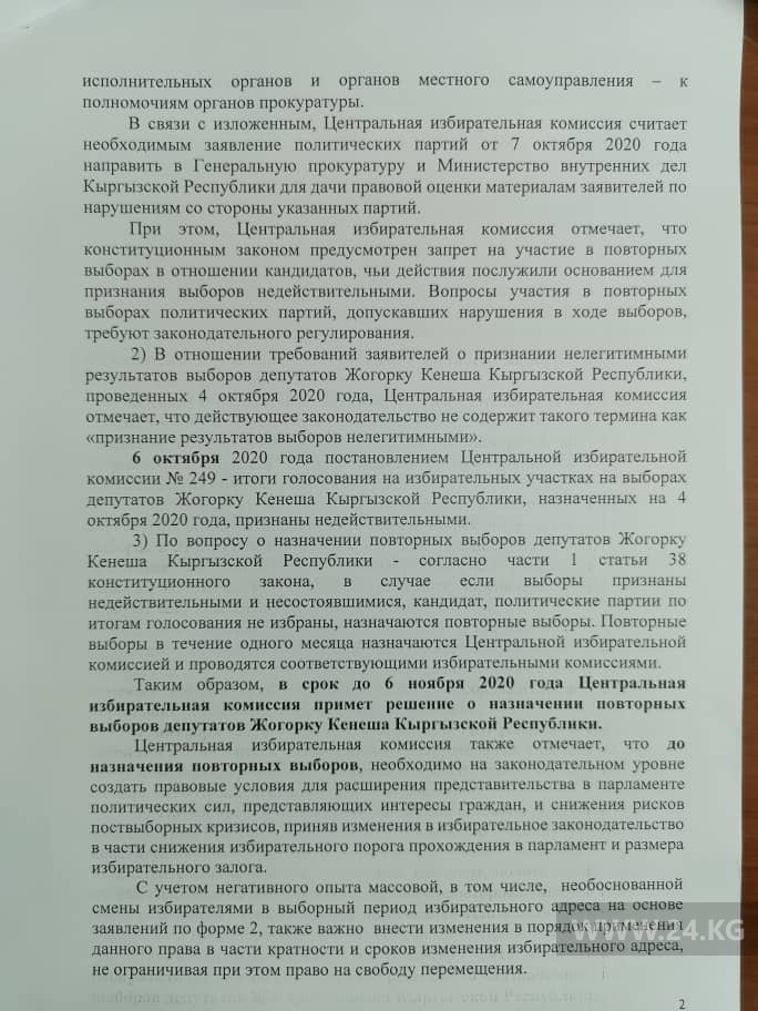 ЦИК назначит повторные выборы в Жогорку Кенеш до 6 ноября. Решение принято по итогам рассмотрения заявления от 12 политических партий, не согласных с итогами голосования 4 октября.