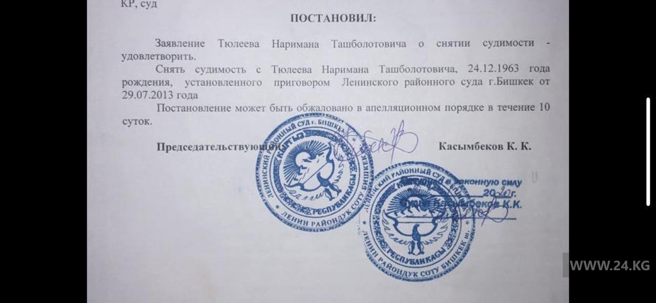 Как сообщил 24-kg.com сам Нариман Тюлеев, в августе 2020 года по решению Ленинского райсуда судимость с него сняли.
