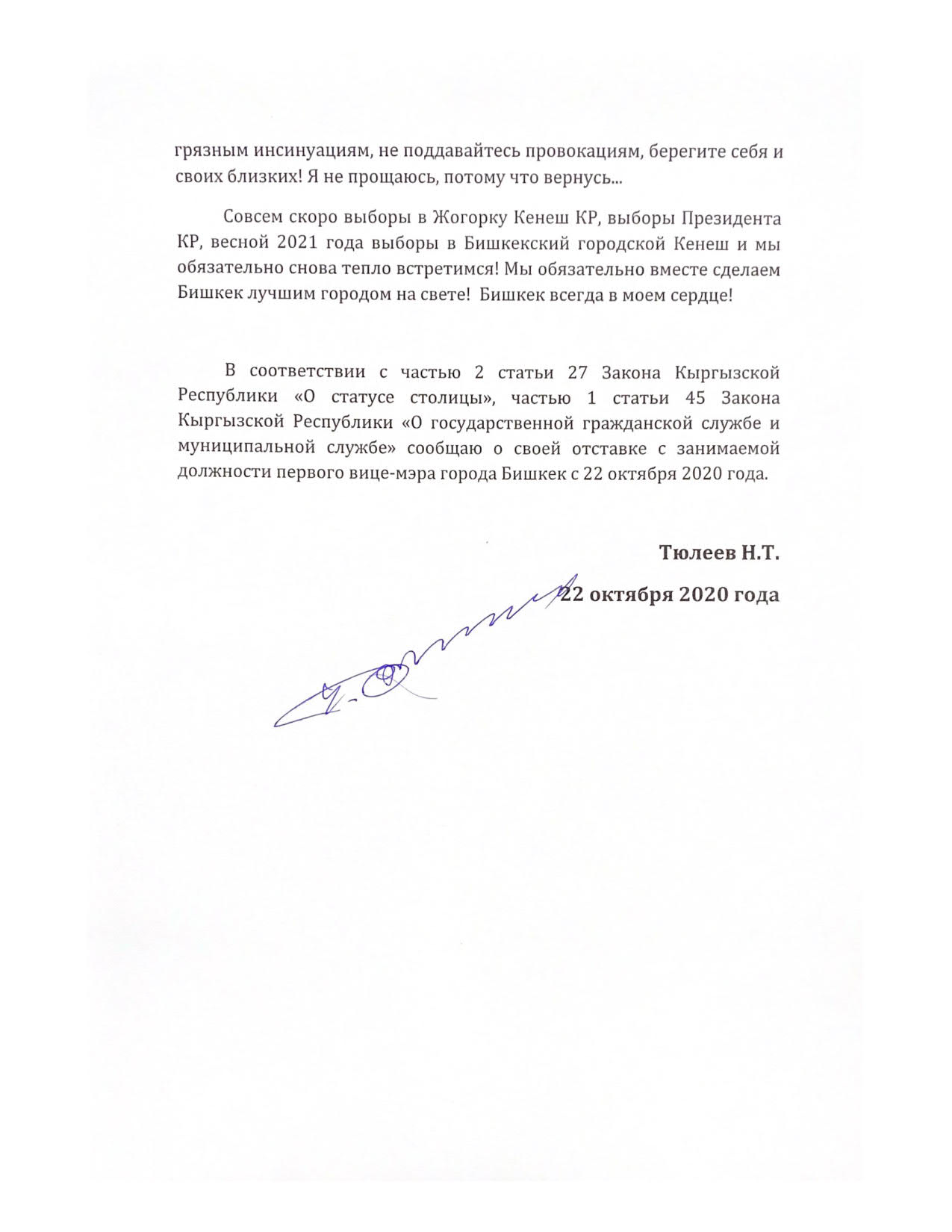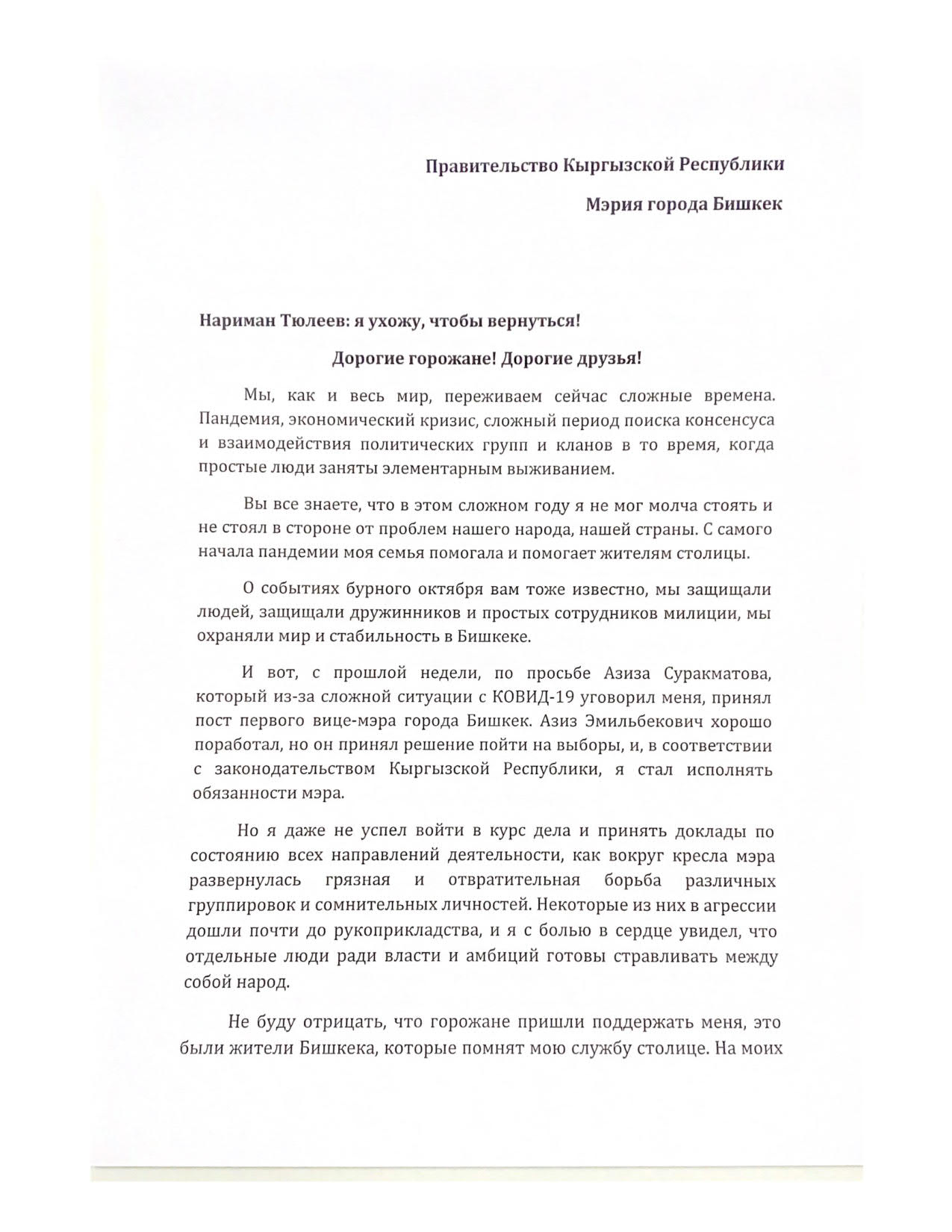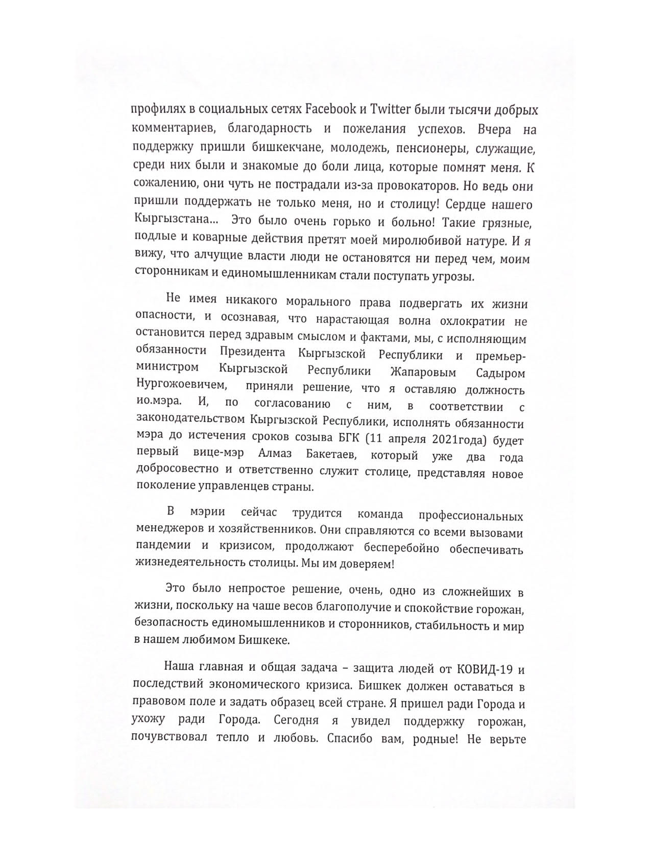«Но я даже не успел войти в курс дела и принять доклады, как вокруг кресла мэра развернулась грязная борьба различных группировок и сомнительных личностей. Некоторые из них в агрессии дошли до рукоприкладства. Не буду отрицать, что горожане пришли поддержать меня. Не имея никакого морального права подвергать их жизни опасности и осознавая, что волна охлократии не остановится перед здравым смыслом и фактами, мы с исполняющим обязанности президента премьер-министром Садыром Жапаровым приняли решение, что я оставляю пост и. о. мэра», — отметил Нариман Тюлеев.