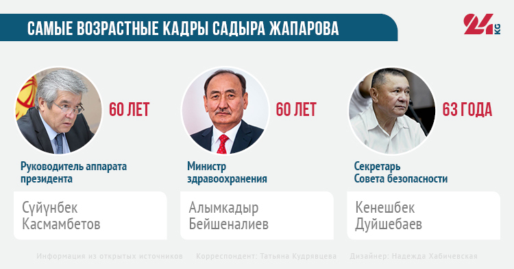 Отметим, что в правительстве на сегодня есть три аксакала, которые старше 60 лет. При этом секретарем Совета безопасности Садыр Жапаров назначил Кенешбека Дуйшебаева, которому в этом году исполнилось 63 года.