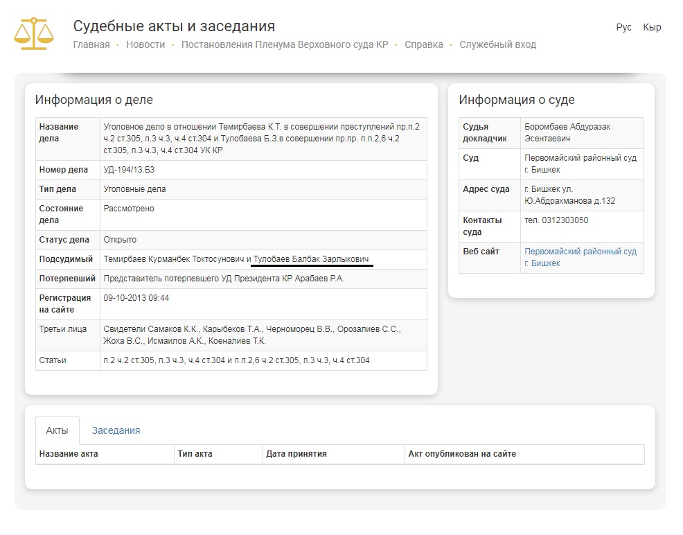 По его данным, Балбак Тулобаев, будучи заместителем управляющего делами президента, по предварительному сговору со своим руководителем Курманбеком Темирбаевым, незаконно получив земельный участок по улице Токтоналиева в Бишкеке, передал его под строительство многоэтажного дома частной компании. Условием сделки было получение на баланс управделами пяти квартир.После окончания строительства их передали различным ненадлежащим лицам.