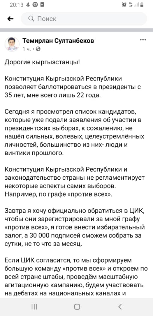 Член политсовета партии «Социал-демократы Кыргызстана» Темирлан Султанбеков написал на своей странице в Facebook, что намерен баллотироваться в президенты.