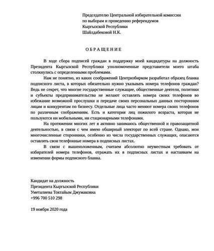 В нем она указала, что Центризбирком разработал новый бланк подписного листа, где нужно указывать телефоны граждан, оставивших свои подписи в поддержку кандидата. По мнению Уметалиевой, это незаконное требование, поскольку если человек не хочет оглашать номер своего мобильного, то его никто не имеет права принудить сделать это. «К тому же многие меняют номера сотовых, и часто. А чиновники, к примеру, или предприниматели и вовсе не хотят писать свои телефоны», — отметила Токтайым Уметалиева.