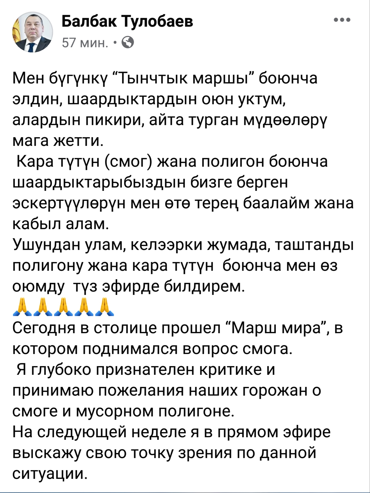 «В столице прошел мирный марш, на котором поднимался вопрос смога. Я глубоко признателен критике и принимаю пожелания наших горожан о смоге и мусорном полигоне. На следующей неделе я в прямом эфире выскажу свою точку зрения по данной ситуации», — написал он на своей странице Facebook.