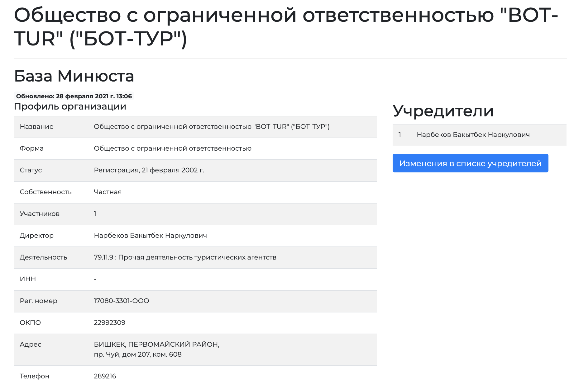 Согласно базе данных osoo.kg, полпред владеет туристической компанией с 2002 года, и в его декларациях данный факт не отражен.