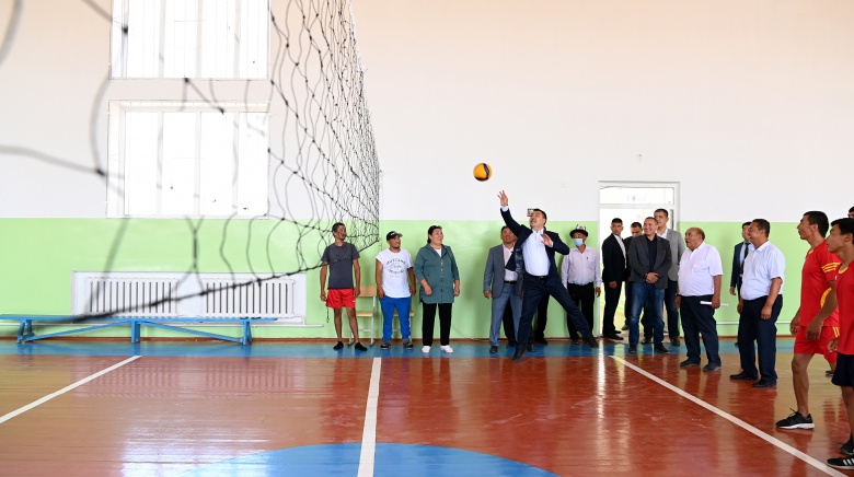 Глава государства осмотрел социальные объекты, в частности новые участковый пункт милиции, фельдшерско-акушерский пункт, футбольное поле, а также восстановленную среднюю школу.