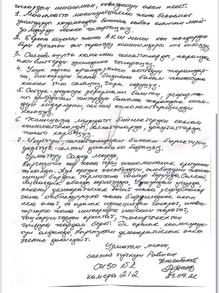 «Вы тоже, как и я, пережили несправедливость, тюремное заключение и знаете цену свободы. Поэтому я хочу верить, что вы воспользуетесь возможностью развивать реальные демократические ценности. Раз вы перед мировым сообществом заявили, что построите демократическое общество, вам придется сделать несколько реальных шагов», — написал Равшан Джеенбеков.