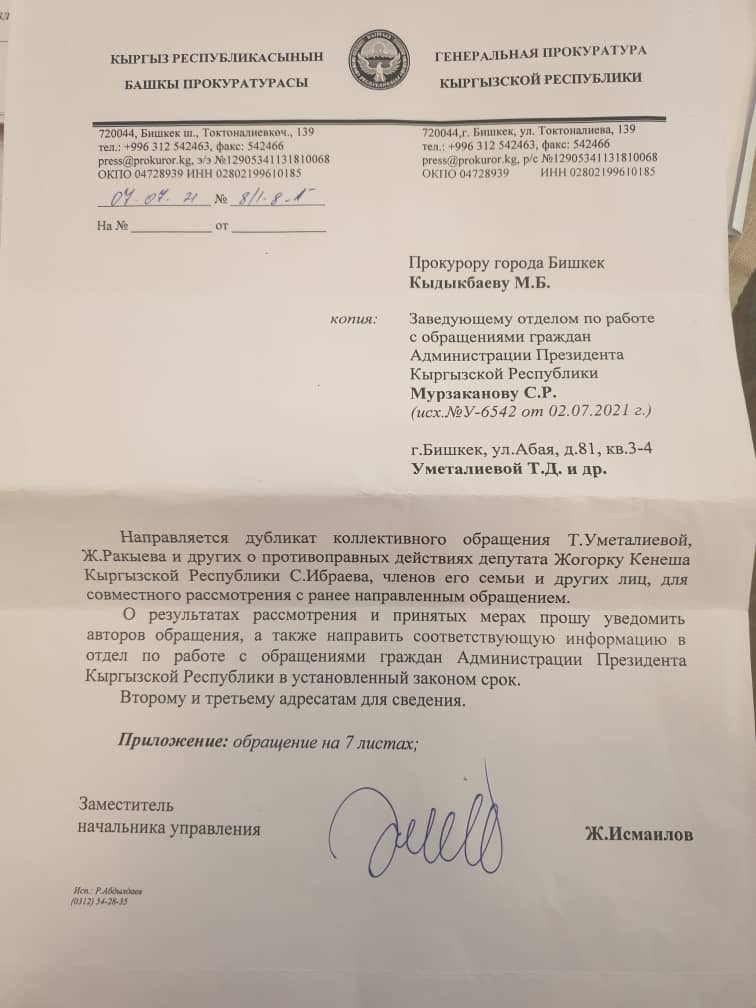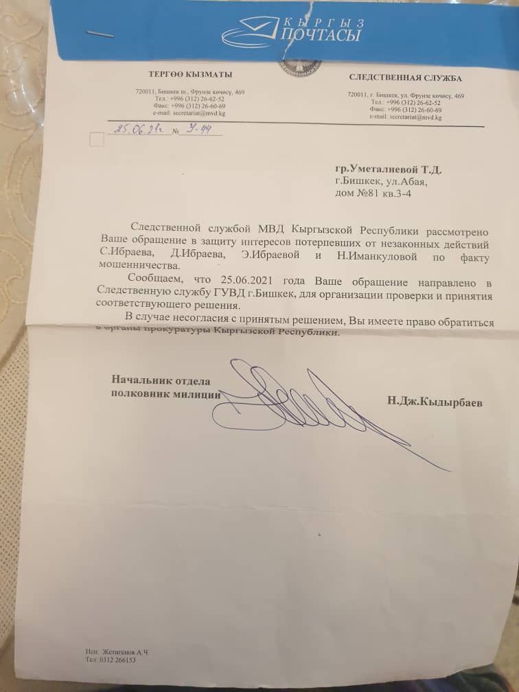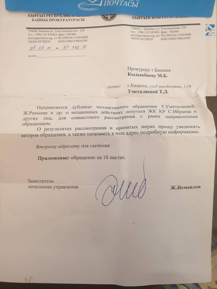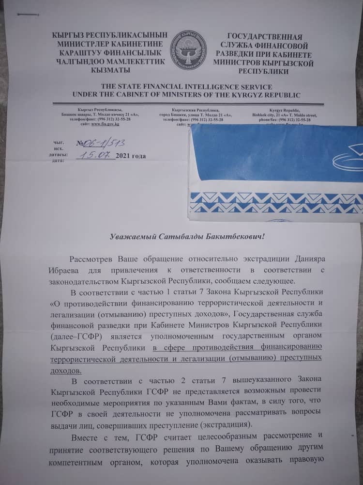 «Самат Ибраев открыл компанию «Строй мир», которая занимается перевозкой арматуры. В 2017 году бизнесмены вкладывали деньги в компанию для того, чтобы потом получить проценты. Спустя некоторое время Самат Ибраев сначала не выплачивал дивиденды вовремя, а затем и вовсе перестал это делать. Позже он открыл еще несколько компаний, оформив на сына Данияра Ибраева, свою сестру Эркингуль Ибраеву и супругу. Официально в Генпрокуратуру, ГКНБ и к президенту обратились 32 человека. Примерная сумма, которую не выплатил Самат Ибраев, — $35 миллионов. Нардеп возглавляет фонд Саякбая Каралаева, показывает свою набожность, а сам обманул людей на крупную сумму денег», — сказала Токтайым Уметалиева.