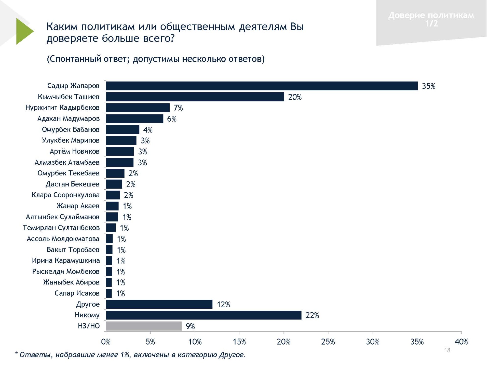 Доверяют Садыру Жапарову 35 процентов респондентов (в августе таковых было 32 процента). На втором месте оказался зампредседателя кабинета министров — глава ГКНБ Камчыбек Ташиев (20 процентов). Рейтинг друга главы государства по сравнению с августом снизился на четыре процента. На третьем месте с 7 процентами оказался Нуржигит Кадырбеков.