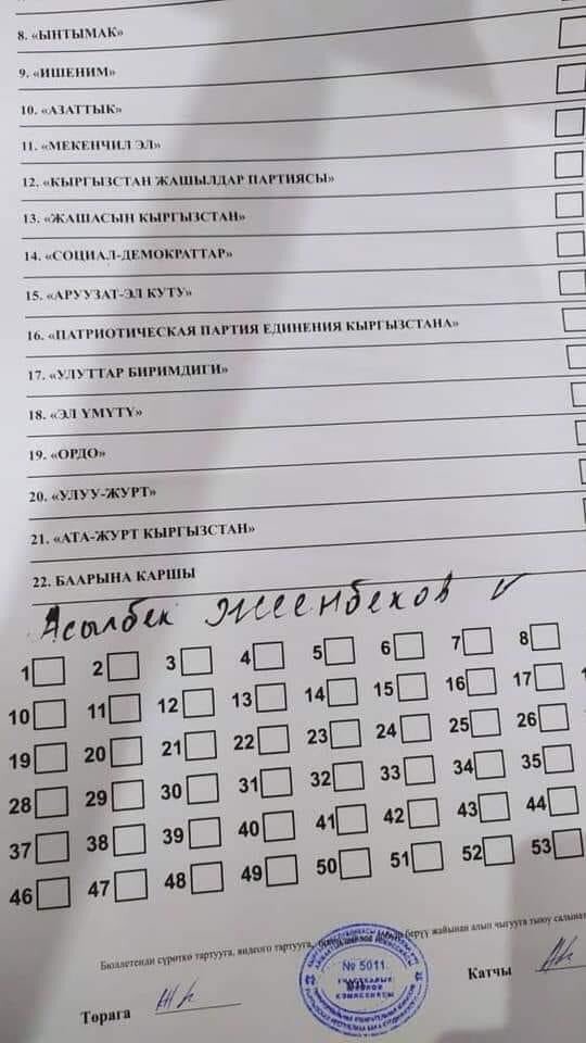 На кадрах видно, что избиратели написали на них нецензурные слова. Еще на одном под списком партий написали имя Асылбека Жээнбекова, правда, с ошибкой.