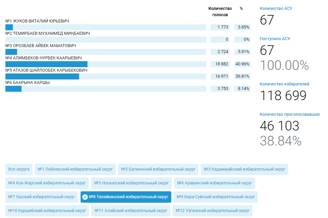 Отметим, по Толойконскому избирательному округу № 8 баллотировались пять кандидатов. Согласно предварительным данным, они набрали голоса в следующем порядке: Виталий Жуков (3,85 процента), Мухаммед Темирбаев (0 процентов), Айбек Орозбаев (5,91 процента), Нурбек Алимбеков (40,96 процента) и Шайлообек Атазов (36,81 процента).