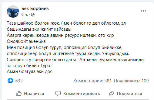 Член победившей на выборах партии «Ата Журт Кыргызстан» певец Бек Борбиев заявил об использовании админресурса на выборах.
