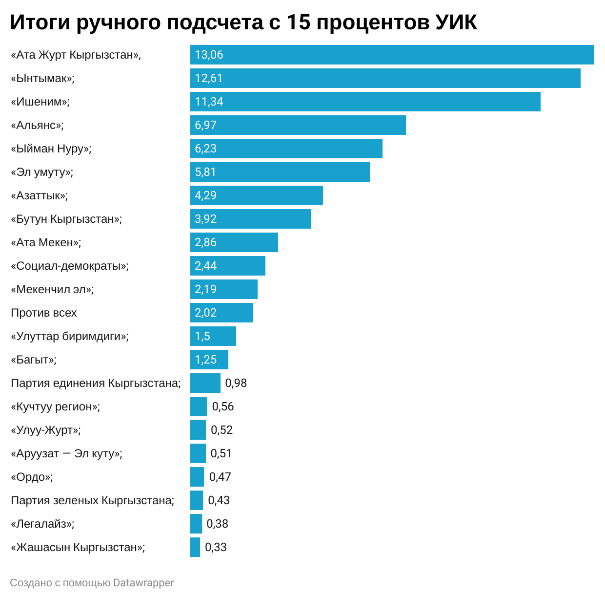 Интересно, что на данный момент подсчитали всего около 16 процентов протоколов с избирательных участков. Итоги выборов в Жогорку Кенеш могут объявить только по итогам ручного пересчета.