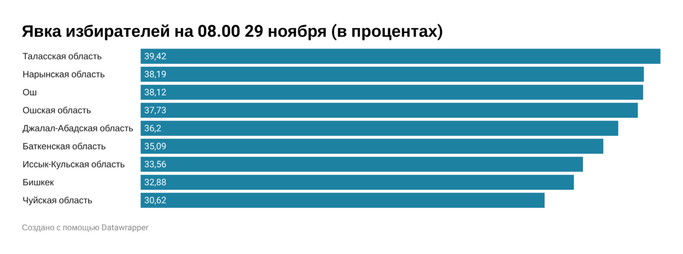 На 8.00 29 ноября на выборах депутатов Жогорку Кенеша по единому округу проголосовали 34,39 процента избирателей. Такие уточненные данные привел Центризбирком.