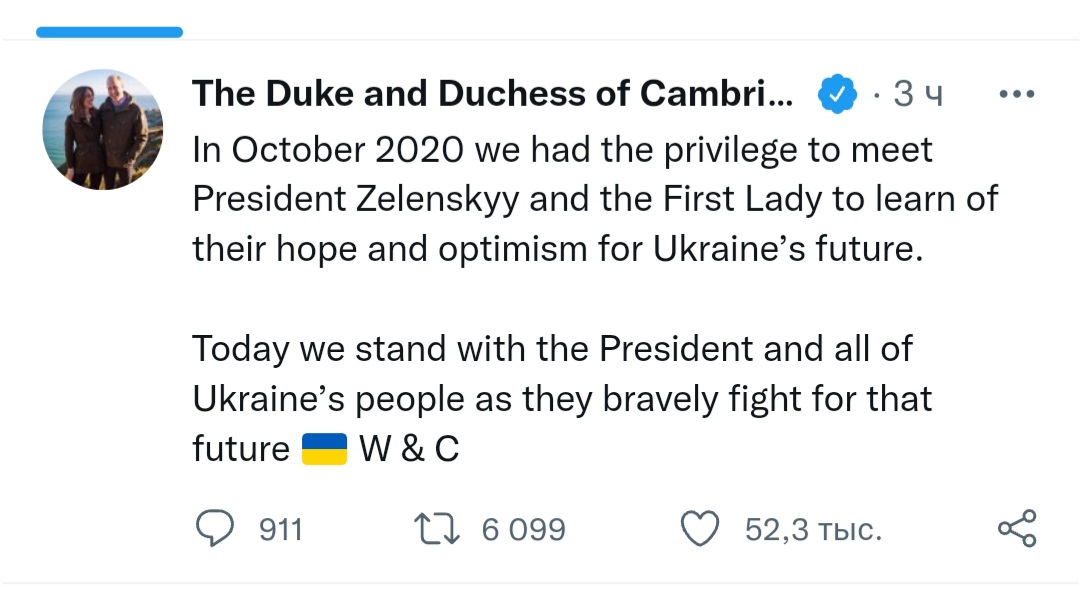 Королевская семья Великобритании принц Уильям и Кейт Мидлтон прокомментировали в Twitter события в Украине.