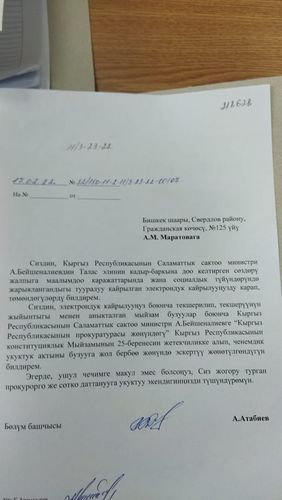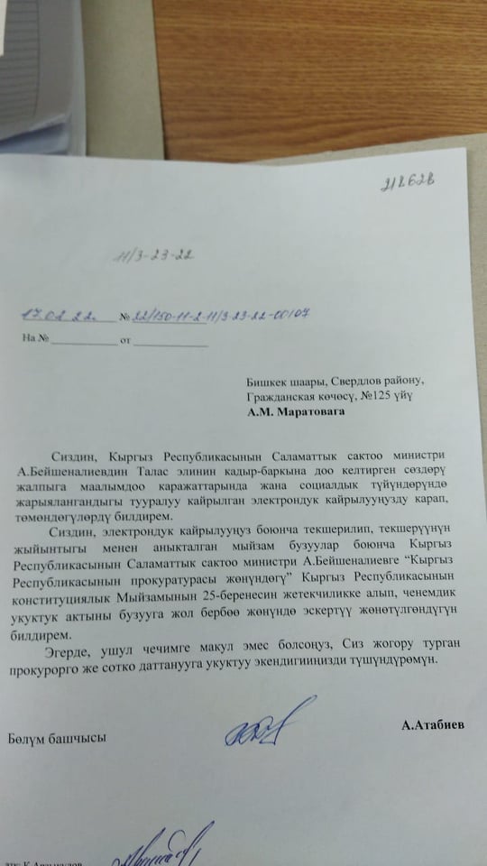 Отметим, ранее журналист «НурТВ» Акылай Маратова написала заявление в ГП КР с требованием дать правовую оценку высказываниям чиновника о таласцах.«Генпрокуратура рассмотрела заявление Акылай Маратовой о высказываниях, унижающих честь и достоинство представителей Таласской области, министра здравоохранения Алымкадыра Бейшеналиева. На основании выявленных нарушений ему дано предостережение», — проинформировал Сирожиддин Камолидинов.