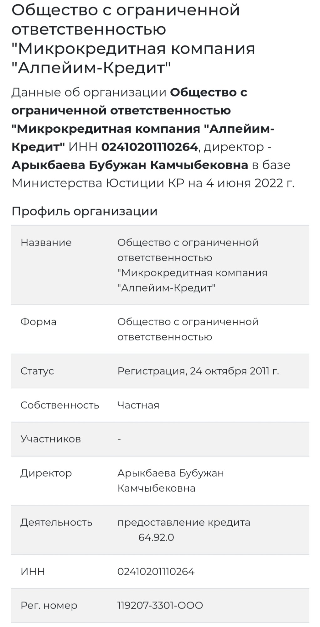 Согласно данным Osoo.kg и Минюста, Бубужан Арыкбаева является директором микрокредитной компании «Алпейим-Кредит». Основной вид деятельности — предоставление кредита.
