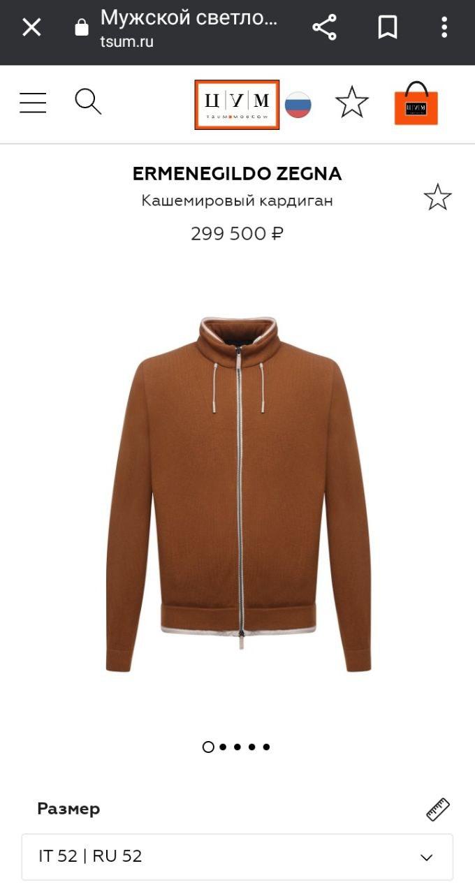 Как выяснилось, кардиган кашемировый, от известного итальянского бренда мужской одежды Ermenegildo Zegna. Его стоимость в ЦУМе Москвы составляет 299 тысяч 500 рублей (около $5 тысяч).