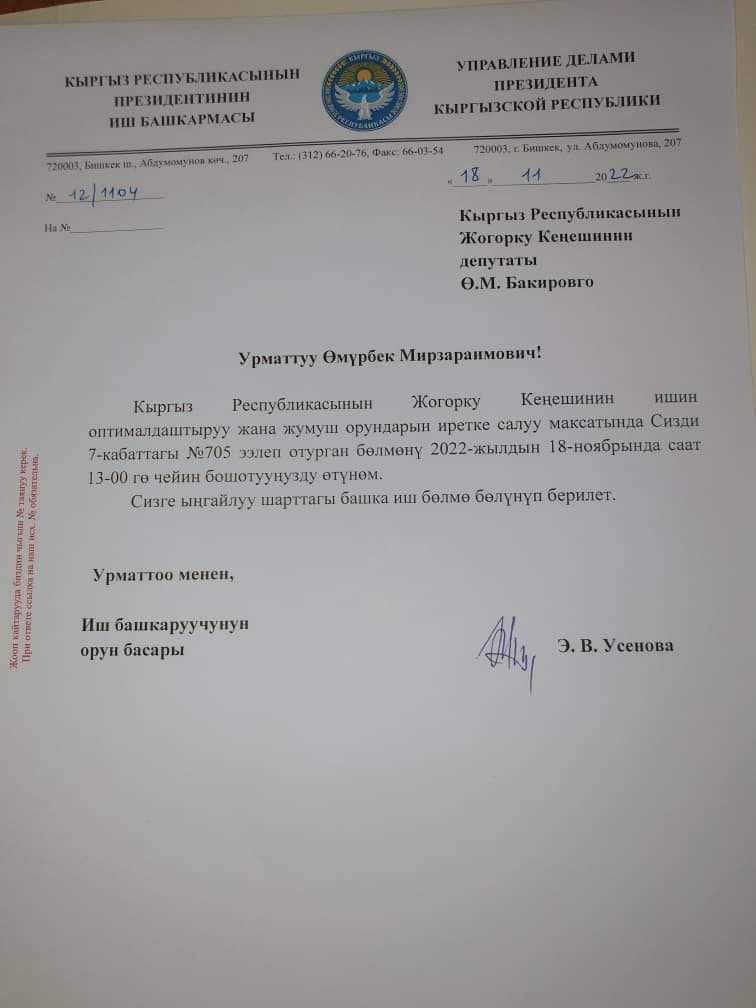 Управление делами президента отобрало рабочий кабинет у депутата Жогорку Кенеша Омурбека Бакирова. Информацию он подтвердил 24-kg.com.