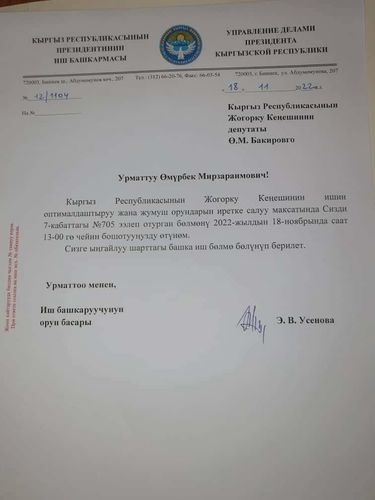Омурбек Бакиров входит в состав депутатской группы «Элдик». Он работал в кабинете № 705 на седьмом этаже.