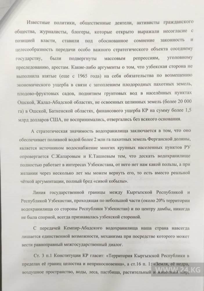 В заявлении он указывает, что известные политики, общественные деятели, журналисты, блогеры, которые открыто выражали несогласие с позицией власти, подвергнуты массовым репрессиям, уголовному преследованию, арестам. При этом какие-либо аргументы о том, что узбекская сторона выполнила взятые на себя обязательства по возмещению экономического ущерба в связи с затоплением плодородных пахотных земель, поднятием грунтовых вод в населенных пунктах Ошской и Джалал-Абадской областях, не воспринимались.
