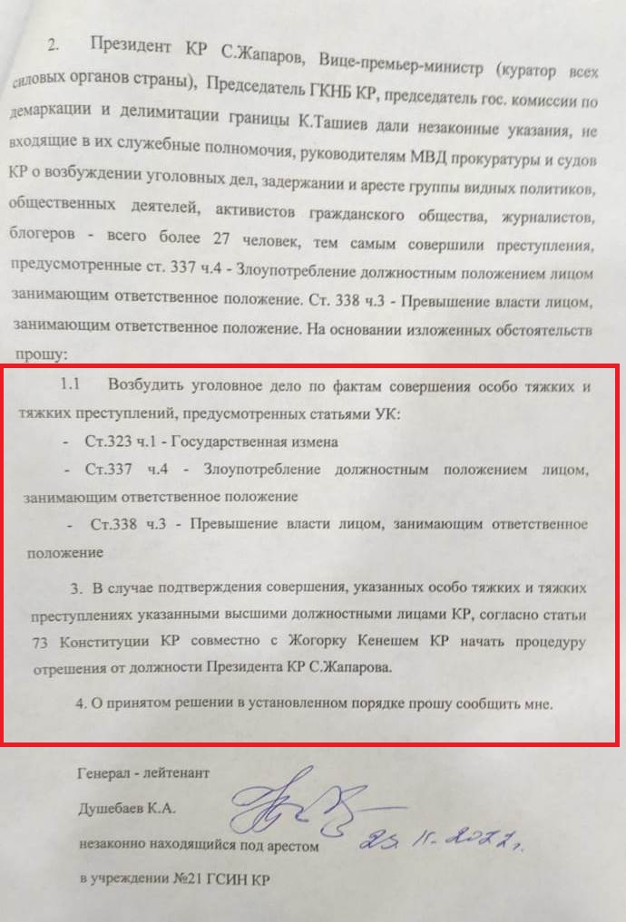 «В случае совершения этих тяжких и особо тяжких преступлений необходимо, согласно Конституции, начать процедуру отрешения от должности главы государства Садыра Жапарова», — подчеркивает он.