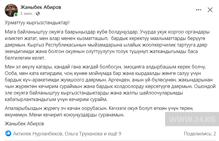 «Вы все стали свидетелями события, связанного со мной. Сегодня работают правоохранительные органы, я готов с ними сотрудничать и предоставить необходимую информацию. Хочу отметить, что готов понести ответственность в рамках законодательства КР, понимаю всю серьезность ситуации», — написал Жаныбек Абиров.