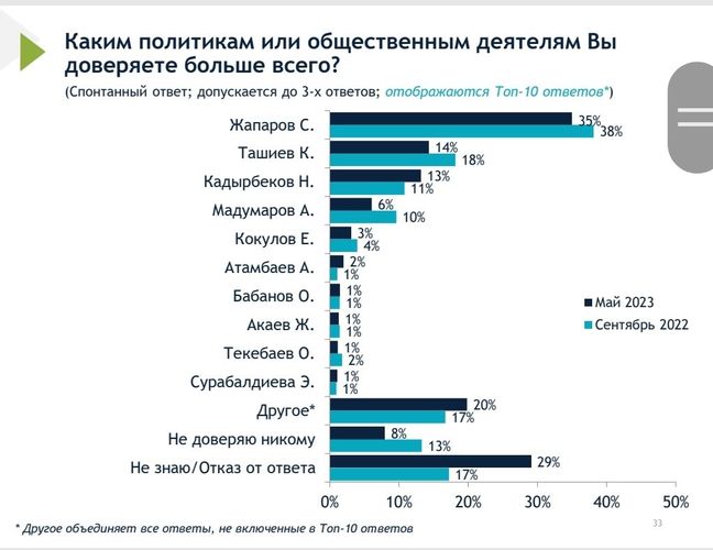 У бывшего президента Алмазбека Атамбаева всего 2 процента. И никому не доверяют из политиков, как действующих, так и бывших, 8 процентов. В сентябре 2022-го эта цифра составляла 13 процентов.