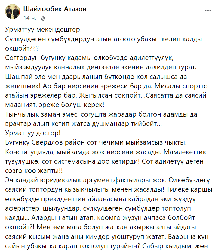Депутат Жогорку Кенеша Шайлообек Атазов, который находится на лечении в Турции, на своей странице в соцсетях прокомментировал решение Административного суда Бишкека о лишении его мандата.