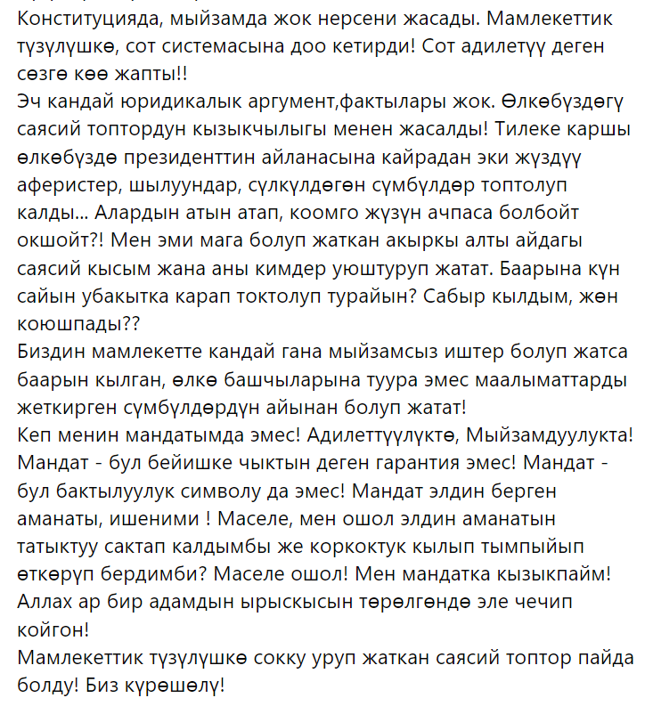 «Такого ни в Конституции, ни в законах нет. Нанесен урон государственному строю и судебной системе. Судья оплевал слово «справедливость». Никаких юридических аргументов и фактов не привели. Это сделано в интересах определенных политических групп. К сожалению, вокруг президента вновь собрались двуличные аферисты, мошенники и подхалимы. Кажется, стоит назвать их имена и раскрыть их личности общественности. Последние шесть месяцев на меня оказывают давление. Я терпел, но они не оставили меня в покое. Все незаконные деяния в стране происходят из-за подхалимов. Они доносят главе государства неправильную информацию», — написал он.