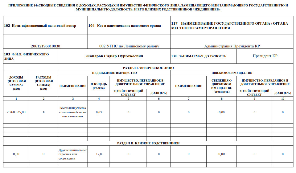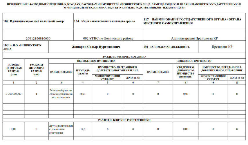 Согласно данным ГНС, за отчетный период он заработал 2 миллиона 760 тысяч 335 сомов. На президента оформлен земельный участок сельскохозяйственного назначения площадью 0,63 гектара.