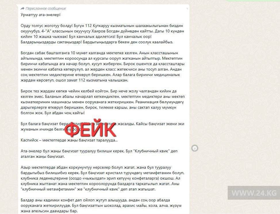 Во время обсуждения Суйунбек Омурзаков зачитал обращение, распространяемое в мессенджерах и соцсетях. В нем говорится, что ученик 4-го класса погиб от передозировки новым видом наркотического вещества и возле школ детям раздают леденцы с наркотиками «клубничный квик». При этом он не назвал, в каком именно учебном заведении и когда это произошло.
