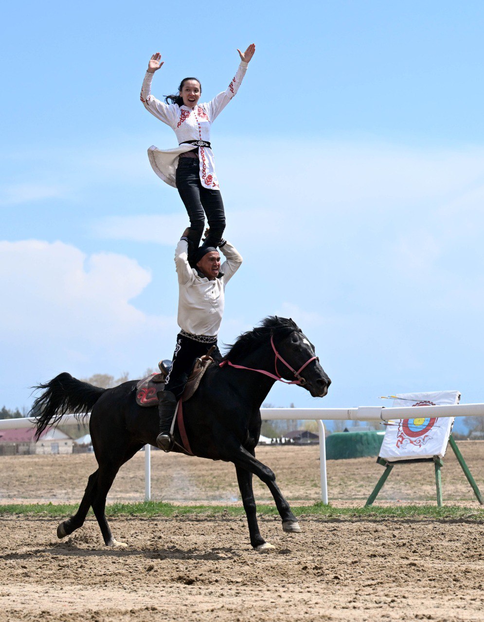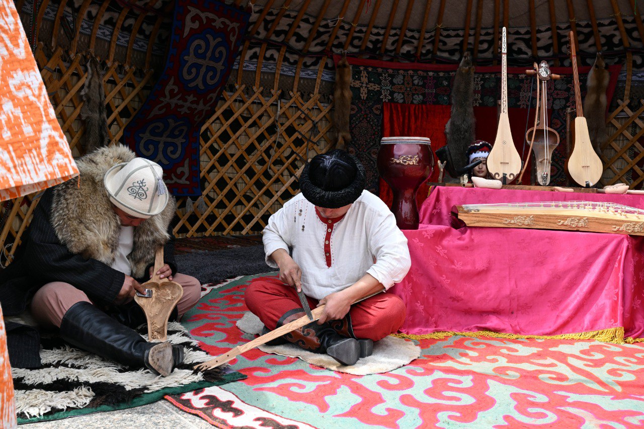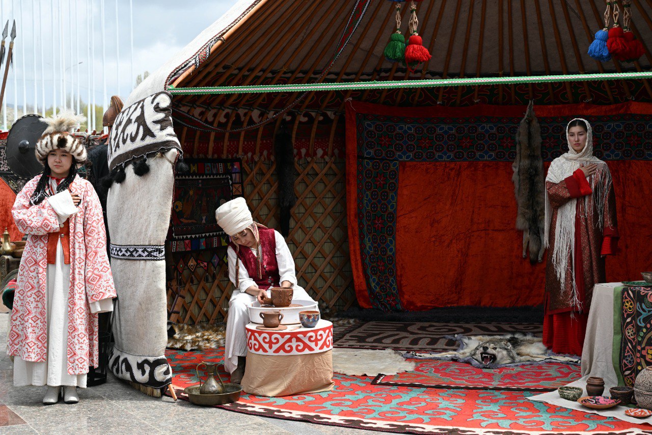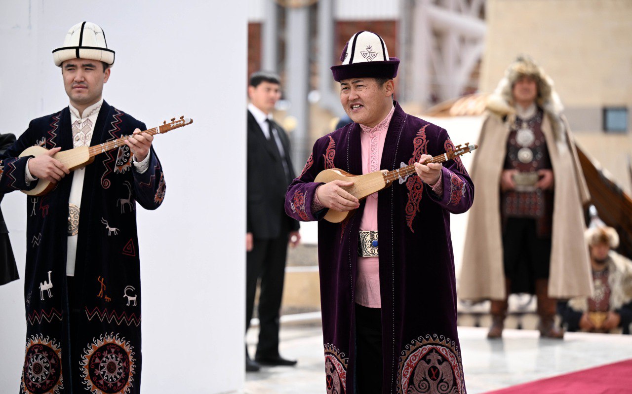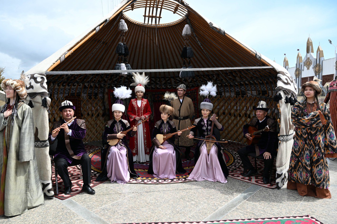У входа на ипподром высоких гостей приветствовали акыны-импровизаторы, после чего делегация ознакомилась с этнокомплексом «Кыргыз айылы», где продемонстрированы элементы традиционного уклада жизни кыргызского народа — юрты, народные ремесла, национальная кухня и костюмы.