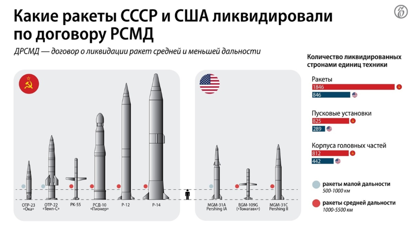 К июню 1991 года Договор был выполнен: СССР уничтожил 1 тысячу 846 ракетных комплексов, США — 846 комплексов. После взаимных обвинений в нарушение договора стороны в феврале 2019 года заявили о приостановке соблюдения своих обязательств. В августе 2019 года договор окончательно прекратил свое действие.