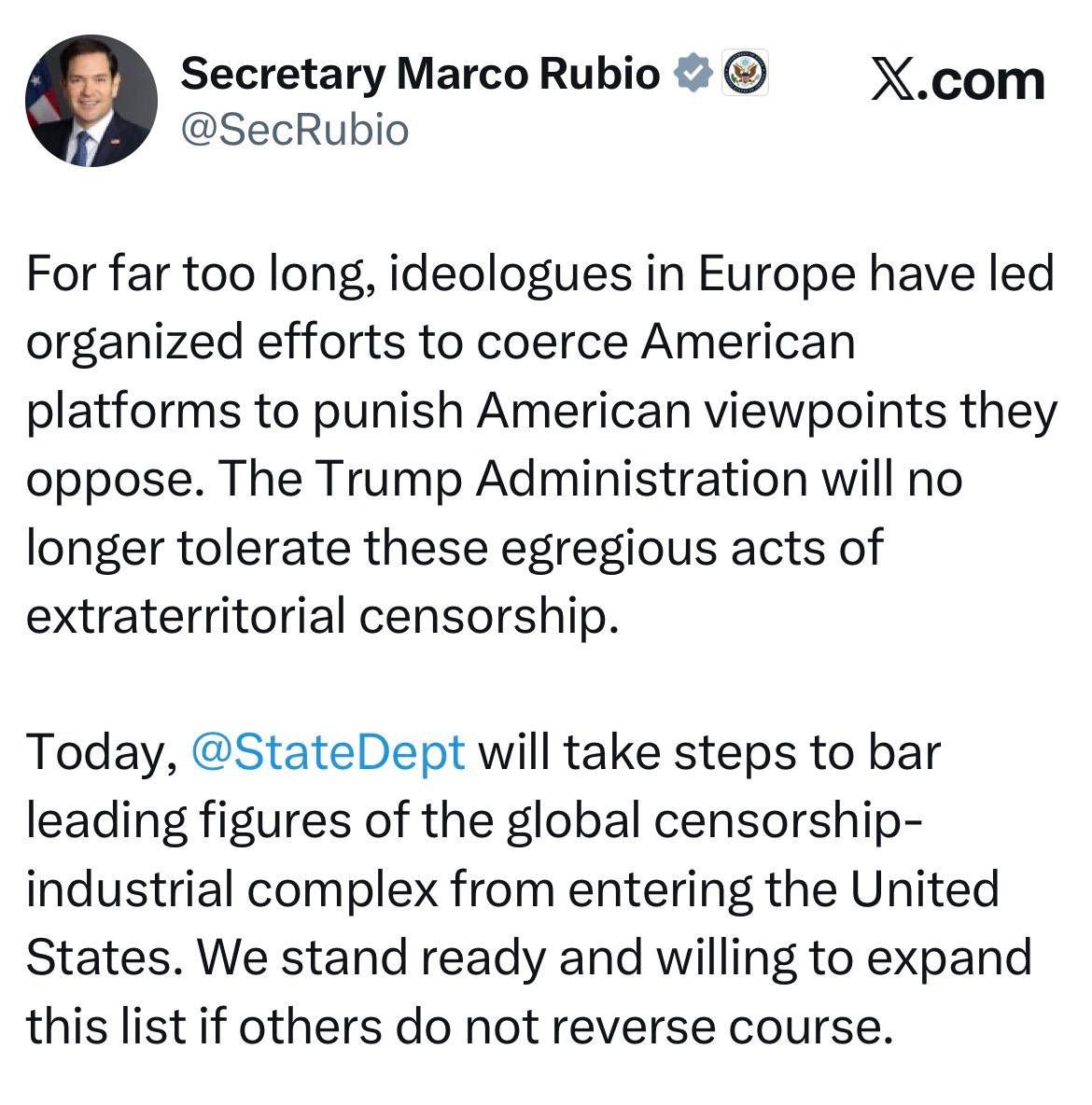 «Администрация Трампа больше не потерпит экстерриториальную цензуру», – заявил он. По его словам, речь идет о представителях так называемого глобального «цензурно-промышленного комплекса», оказывающих давление на технологические компании США.
