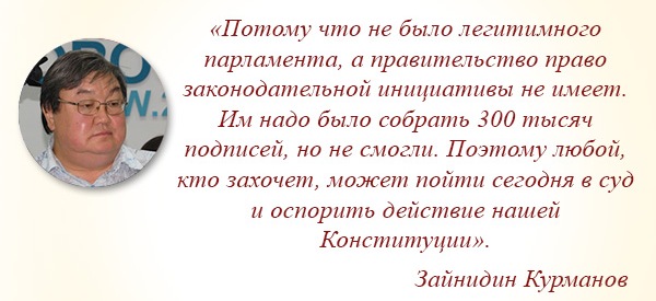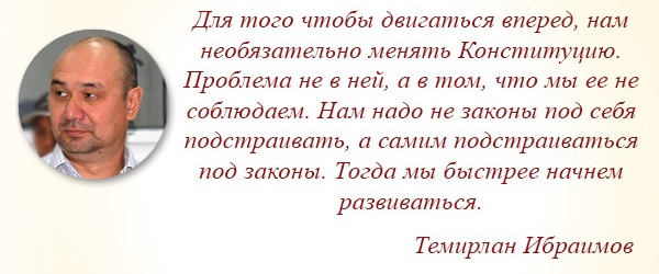 Он также напомнил, что в мировой практике отходят от принятия Конституции на референдуме. «Все понимают, что это сложный закон, не каждый может разобраться. Туда можно выносить простые вопросы, например, выбрать форму правления. Даже СССР был более честен в этом. Поэтому нам тоже надо запретить такое выносить на референдум, и сразу конституционный зуд закончится. В стране нет конституционного движения, если было бы, значит, граждане хотят перемен, если такого нет, значит, перемен хотят политические силы», - объяснил Зайнидин Курманов.