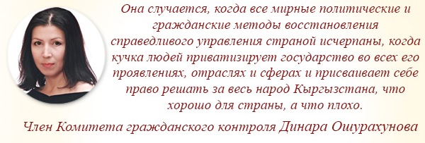 «Действующая Конституция была рождена как итог народной революции, всколыхнувшейся в ответ на узурпацию власти и правовой беспредел авторитарного режима Курманбека Бакиева, - напомнили Алмазбеку Атамбаеву авторы обращения. - История Кыргызстана дважды показала, каким тяжелейшим испытанием для народа и государства является революция. Революция - это крайняя мера, но прогнившая и зарвавшаяся власть не оставляла гражданам никакого другого пути».