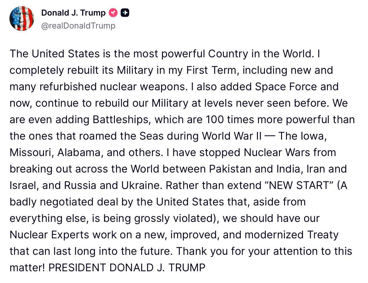 «Я предотвратил ядерные войны по всему миру между Пакистаном и Индией, Ираном и Израилем, а также Россией и Украиной. Вместо того чтобы продлевать «Новый Договор СНВ» (плохо согласованное со стороны США соглашение, которое, помимо всего прочего, грубо нарушается), мы должны поручить нашим экспертам по ядерным вопросам разработку нового, улучшенного и модернизированного договора, который сможет действовать в долгосрочной перспективе», — написал Дональд Трамп.