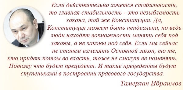Эксперт пояснил, что даже если целью поправок в Конституцию является стабилизация ситуации в стране путем дачи преференции каким-то политическим силам, последствия этой операции довольно призрачные. «Даже если результаты будут в краткосрочной перспективе, то в долгосрочной – а в условиях КР это 2-3 года - они непредсказуемые. Потому что власть, нарушив один раз закон, получает ощущение безнаказанности, и происходит сбой в госуправлении, как было в 2005 и 2010 годах. Можно называть эти события как угодно – мятеж, революция, бунт, переворот, но это была внеочередная смена власти, потому что правящие силы нарушили закон», - напомнил Тамерлан Ибраимов.